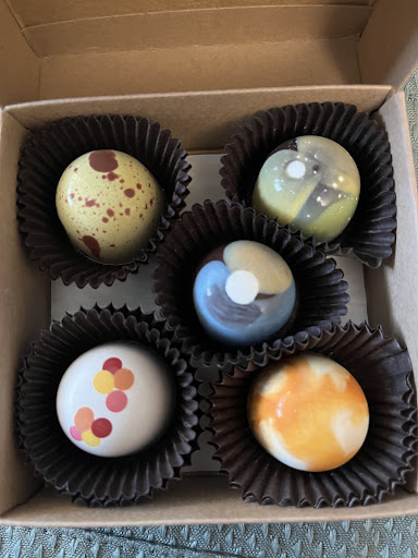 Read moreWhat a brilliant little shoppe! As soon as you enter, you are swept up in a Willy Wonka of old euphoria of chocolatey delight. There is drinking chocolate behind the counter, heated and stirred to perfection, with a choice of milk or dark chocolate. Mind you, this is not your typical "hot chocolate", but authentic chocolate for drinking, rich, creamy, and thick. Bars of flavored chocolates with fruit and nuts line the side wall, along with gift style soapstone cups, and beautiful flatware. The back wall features a window into the chocolate decorating room, where you can view the artistry that goes into making the sweet confections. Cases of bon bons are visible in line to the counter, each one filled with exciting and exotic flavors. Our family looks forward to returning during a...