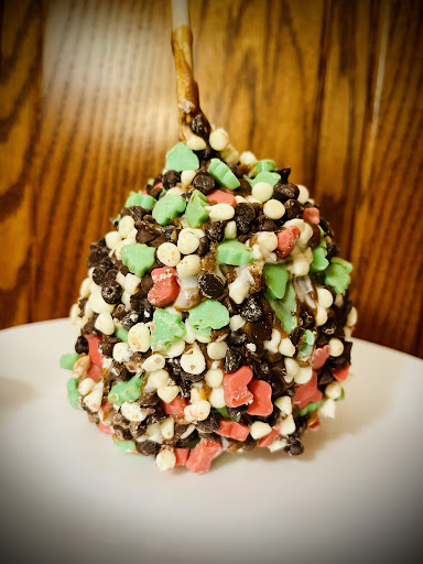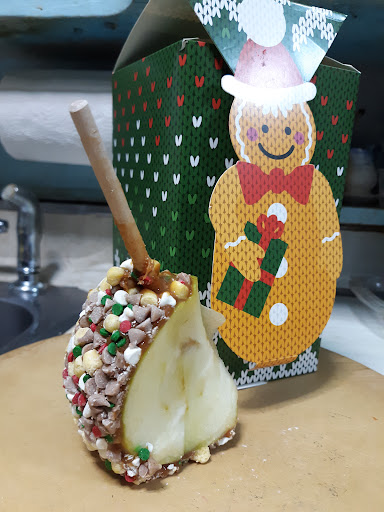 I had never tried a candy apple before but my first experience with Mrs. Prindables has set the bar very high! It cuts fairly easily, making it simple to get little slices to share; plus, you don’t have to eat it all at once. It preserves very nicely in the fridge afterward (up to two weeks, so I’m told, though I doubt there will be any of mine left after 14 days; it’s too good!). I got the triple chocolate one and it’s so cute and festive. It has mini chocolate and white chocolate chips on it, plus tiny red stockings and green Christmas trees. A layer of caramel holds it all together over a Granny Smith apple base. Even if you’re not sure you’ll like candy apples (or haven’t enjoyed them in the past), I highly recommend giving one of these a try. They make a delicious, fun, festive treat for a...