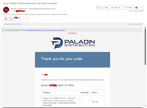 Needed to replace a light that was originally ordered from Paladin online. Because I was only ordering 1 light to replace a light damaged by the movers my order was canceled without notice. After not receiving the light on the shipping day given I tried to call, only to be greeted by their online site phone number that does not except calls. I was able to call their physical store without any resolution. Seems like no one really knows what is going on and the physical store doesn't talk with the online store. As always no problem taking my money! The contractor that did the build out on this job said he spent over $10k and will not use them again. This review has been edited after Paladin commented. Had a funny feeling they would try to call a bad review a lie. Here is the proof I have. Feel free to post the picture of the supposed cancellation email. Here is my proof. Notice they did not even contact the online branch to confirm my store, as I did try and handle it their obscure way.