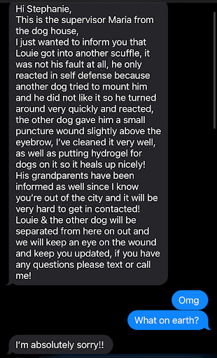 Now moving on... On Sunday, I receive a call that Louie was in an "incident". Mind you, I am in Mexico and my reception is spotty at best so this communication takes a solid amount of time for me to subsequently understand that he is mostly okay. Louie is a very sweet and friendly dog who has grown up being a part of boarding and daycare as some folks rely on trusted providers to fill their gaps. I asked for a picture. I find it unclear if he is truly hurt or they were just documenting "an incident"? My parents who live in Niles were kind enough to go by to take a quick look and they confirmed he seemed happy and okay. I feel better, at least in the moment, as dogs are animals at the end of the day and I consider myself a mostly reasonable person until Monday rolls around and I receive another text I will share here.