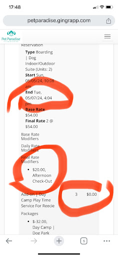 The excuse I was given today was that grooming reservations come through as baths and you have to CALL to make an actual grooming reservation. No where on the website does it say to call but days say you can do it online. Then claimed the actual grooming reservation was changed to the 20th. This was not done by me (funny at first you can’t see the reservation, not claim it’s there on the 20th? Which is it??) The worst part? There was another customer in the lobby when I picked up my dog that had the exact same issue. Additionally my dogs shots expired the third day she was there - I had an appointment with her vet after I picked her up. The staff said I was required to have it done by them while she was there. So they made sure to give her those shots, but didn’t bother with anything else I asked of them.