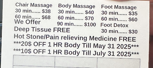 Read moreWent there for the first time for a couple massage deal that we got from Groupon and it exceeded our expectations, it was really really good! It was front, back, hands, feet, hot stones, hot towel, everything it was a real full body massage, we also had to move our appointment time and they easily accommodate us to our preferred time, overall a 10/10 experience and we can’t...