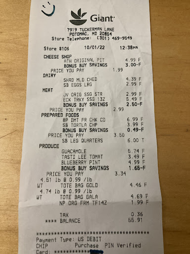 Read moreAs soon as you come in the store, rotten cantaloupe. I went to pick out some plums, theyâre all mushy. On to organic bananas, over ripe. Plenty of shower gel and shampoo, but where is all the lotion? Went to check out and their system was down. It rejected my card so, I checked my bank account and the transaction went through, but the employees told me their system did not process the payment after I showed them the statement in my account. They suggested that I make a second payment. When that didnât work, they told me to go get cash. I heard bad things about Giant as a new resident to this state but, I found out the hard way. There are plenty of better...