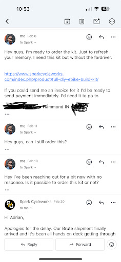 Read moreWhere do I start? Zero communication once they get your money. $500 cancellation fee. $1000 restocking fee. Every excuse is about being understaffed but they are taking trips around the country to show their bikes while costumers are waiting past the promised fulfillment date.