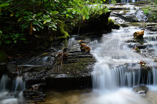 As you hike down the trail, Grassy Creek will be on your right, affording some nice views of smaller falls before you reach the main ones. The main falls will be obvious. However, the trails that provide access to the falls themselves are less evident. During my trip here, I spotted two trails that lead down the fairly steep (appx 50-degrees) slope. The first involves climbing down some sharp drops involving boulders. The second is more forgiving, but in muddy and mossy places is treacherously slick.