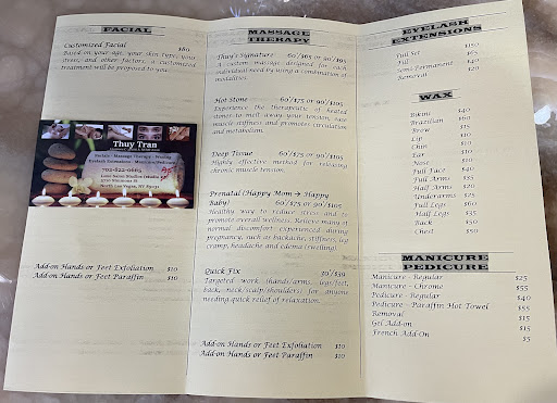 Fantastic massage by Thuy (Tweety) Tran. This is a location that has multiple vendors inside in private roomsâmassage/nails/hairâŠ. Mrs. Thuy has a small private room and sets her own appointments with her husband helping with scheduling. He answers the phone and helps with calls/questions, etc. as she doesnât answer her phone while in a session with her client. Her business card is listed on the photo that is posted with this posting. Her room had aroma therapy, was quiet, and with a single massage table. If you are simply wanting a massage session and not in need of the ambience of a resort spa, I highly recommend her. There are other vendors in the location for hair/nails, etc but I have not tried them. Highly recommend her after I had a 90 minute massage treatment to treat my low back tightness and upper shoulder/neck tension. Thanks Thuy (her...