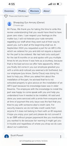 If there is an option to rate this zero I would rate it so. I had a disappointing experience at Sheepdog Armory, mainly due to the rude and unprofessional behavior of the man working the front counter. He’s an older white male with a large build looks like Santa Claus.If you’ve been there, you likely know exactly who I’m talking about. I came in to pick up my order and maybe do more gun shopping but changed my mind quick!