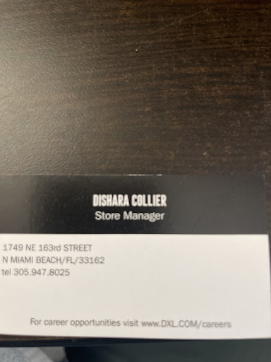 Read moreI needed to update some of my wardrobe and decided to go to DXL, located in North Miami Beach, Fl. To say that my experience was a PLEASURE, would be the understatement of the year! This store is well stocked, clean, merchandise easily accessible and clearly marked! The Store Manager, Ms. Dishara Collier is the definition of PROFESSIONALISM! She cares about the customer needs and will bend over backwards to make her customers satisfied! I have passed by this store for many years and I am so happy that I stopped in for the first time and it wonât be the last! In a time when customer service is lacking in so many businesses, it was a joy to shop at this establishment! If I could give DXL a 10 Star review, that would not be enough! I will be recommending DXL OF NORTH MIAMI BEACH AND MS. DISHARA COLLIER TO ALL MY...