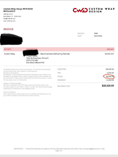 I had a troubling experience with Custom Wrap Design LLC. On May 20, 2025, I requested a quote for wrapping the wooden cabinets in my boat, and they quoted me $12,300 plus tax, promising completion within 5-7 days. Unfortunately, the job took nearly two months to finish. To make matters worse, I received an invoice for $38,250 after the work was completed, 3x the original amount, without any prior notice. The new invoice maintained the same square footage as the original. They provided numerous excuses, claiming it was my fault because they never took measurements and based their estimate on the numbers I provided. However, I have text messages confirming that they received measurements from one of their team members, and the invoice stated they would take final measurements before starting the job.