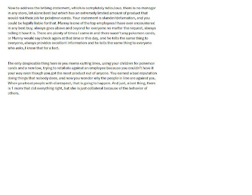 There is group of moms that come to the drops to get pokemon cards, the usually come by themselves and wait in line properly like everyone else. The moms were making comments that they will start bringing their kids so they can get more products because of the limits. Manny is usually there on the drop days and there were never any kind of issues whatsoever, Manny is always on top of things.