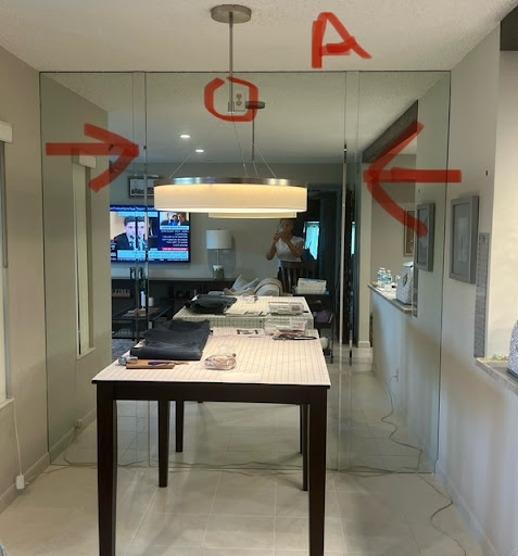 My floor tile was butt up to the old mirror; the guys removed the old mirror so effortlessly and without breaking or cracking any floor tiles (see after pic G)!! On the day of the installation, an entire team of guys showed up. Dawing and those guys did a beautiful job installing the new glass and the black metal grid (see after pics D & E). They had to shave the baseboard a little bit, and they did a flawless job (see after pic F). The mirror and grid adds a more modern feel to my space; it's so beautiful. I am beyond happy, and the price was reasonable too. The new mirror is also clearer than my old mirror and is reflecting true colors.