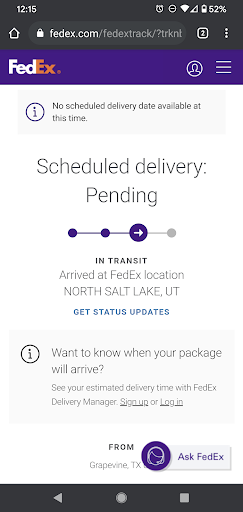 The next day, the exact same tracking number was assigned to the exact same package a second time. Tracking number #1 stated Delivered, while tracking number #2 (which was, again, the exact same tracking number as #1) stated Pending. I talked to the same employee as I had the night before, and learned that it still hadn't left the building, but it was now assigned to a specific delivery truck so FedEx at least knew where it was supposed to go.