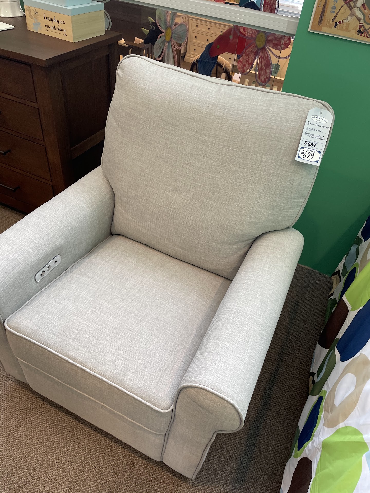 There was also a wide range of glider rockers available, some with ottomans, some without, and some that were also recliners. Several of the recliner styles also electric buttons to put up and down the footrest, and a USB-B plug for any usb power device or charging cable you may want to plug in when you are in the chair.