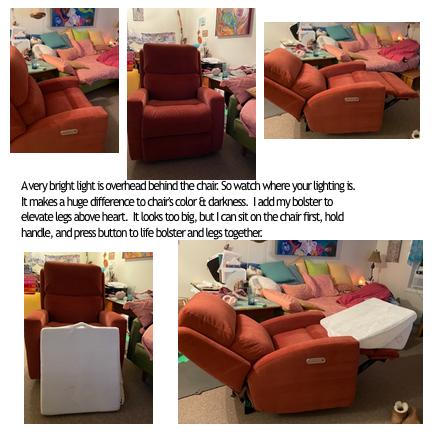 CHAIR CONTROLS / MOVEMENT - Easy controls on outside right, easy to reach and use. I preferred the look of the inside arm controls, and easier to see - but felt awkward to reach. The Elevation system should be clarified - it IS best form in not bending at knees [which is bad for knee recoveries],and into a nearly flat extension to stretch out / nap. I literally fell asleep in it the 2nd time I sat in it. However, it does not elevate your knees or feet above the heart. To do this, an extra bolster or pillows are needed. My method = Using my wedge bolster with a handle [bought elsewhere] - set it on the floor in front of chair. Sit on chair with legs over this, then lift while holding carry loop to elevate the bolster along chair / leg lift. I opted for a battery pack to use less overall electricity and be able to use it in an outage. It simply unplugs and slides under the chair.
