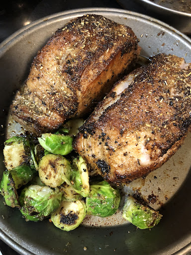 The young man at the register gave me great cooking tips when I asked him how he would cook it. I ended up sprinkling the loin with garlic powder, Herbs de Provence, and s&p, then searing all sides in a pan, before baking it at 425° until the internal temp was 145,° which leaves the center slightly pink (15-20 min). Let it rest for 10 min before slicing.