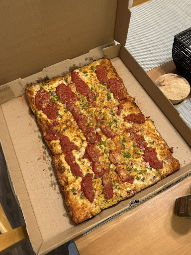 The flavors were good, but the pizza was very undercooked. We got a large Detroit style pizza and when you lifted up a slice, the slice would go limp and it couldn’t hold up even remotely by itself. The toppings would just slide off the slice. The person eating it with me also (unprompted) made a comment that it’s raw. We had to throw it back in the oven to let it cook a little more. If I were to order again, I would ask for the well-done option.