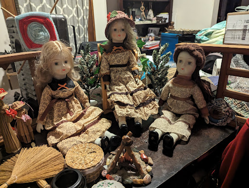 And then the toy store. The vintage toy store is really cool too. They had the sale fill a box for $2. Well I filled like 10 boxes and she only charged me like five bucks. So that was really nice of her and I got these three amazing dolls. They have no date on them so I don't know exactly how old they are. All three of them are in a brown and cream outfit. Each one is a little different but you can tell they all go together. I call them my three little witches