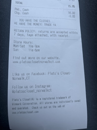 Great overall experience! Highly recommend making a trip to this Plato's Closet. The store was clean and organized. The staff was super friendly and the process to check-in to sell my clothes was easy. There's a ton of great inventory, so I shopped around while I waited for them to go through the clothes I brought in. It only took about 15 minutes and they bought a handful of things. I was also offered a brief explanation as to why they couldn't take certain items. I walked out with some cash in hand and bought a great pair of jeans...