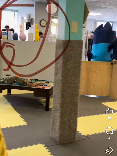The cleaning products in question were on top of the half wall when you walk in the door by the play area (not in the kitchen). Unfortunately I didn’t take a photo while I was there however, I was able to find one on their social media and will attach below. Very dangerous that could easily be knocked over into the play area or a taller child would be able to reach and grab. I also was able to find photos of trash overflowing as well as the unkept flooring, chipping paint, stained foam boards, lifting on the corners of the foam boards (tripping hazard) as well as hair and dust all over the play area. I will link the photos below.