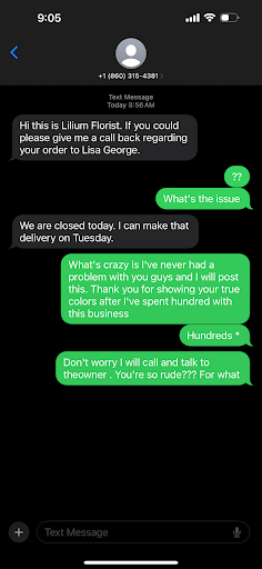 When I called the shop the next day I asked to speak to the owner. I emailed her the pictures and told her of my embarrassment & disappointment she wasn't concerned at all. Didn't really seem to care. Offered me $10 discount on a FUTURE purchase. Told me that she has never seen a mostly white colored sympathy arrangement. She must believe my friend lied because she told me that the arrangement was at least 15-17 inches high. It is just over 13 inches. The owner also told me that she did not see the arrangement. She was away the day before. Obviously she trusts her workers completely and blindly sides with their work even when a customer complains.