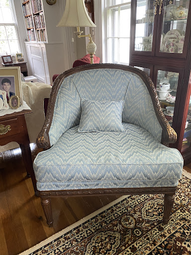 I took it in, picked the fabric and three weeks later I got my chair back, just as comfortable as I remember it. Jan went the extra mile and included arm rests (which I doubt were on originally), and make a lower back pillow with the extra fabric.