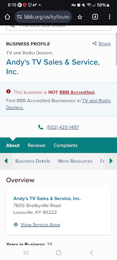 I am months late in providing this review, but Andy's TV Sales & Service was so top knotch I had to leave it even though it was late. It started in Feb of 2022 when my mother purchased a brand new Samsung flat screen TV. It was defective out of the box but I didn't know it. Her display was strobing/flickering/blinking.. whatever you want to call it. The image would stay on the screen but the backlight would get brighter and dimmer rapidly as if you were in a 90s rave club. She didn't tell me she was having issues with it until it was so bad the flashing would stay on constantly and it gave her a migraine to watch. I called Samsung and after 2 hours of messing with settings they finally agreed to have a repair partner come out to repair the TV. The first company they contracted with stood my mom up twice and then randomly showed up to her house on a day they were not scheduled and called her to ask her why she wasn't home. We called Samsung back and requested a different repair partner and were given Andy's. From that moment on, the experience was wonderful. The owner called my mother to find out what was wrong. Based on her response he pre-ordered a part so he could have the TV fixed on the first visit. His communication was excellent and he showed up when promised. Turns out that her TV was having an issue that he had never seen before. He spent a good chunk of time troubleshooting the TV, constantly assuring us that he would get it fixed and not to worry. He ended up having to order a whole new display and came back a second time to install it once received. He was very respectful of her home, and property. He was very gentle with everything he did and he got her TV fixed beautifully. I will never go to any other TV repair shop. Andy's in the absolute best! Months later, her TV is still working better than new...