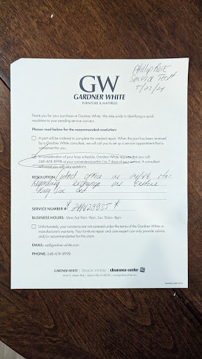 In August I spent almost $7000 on furniture. The salesman was great and very helpful as noted above. Over the last three months we have noticed the poor quality of our chaise lounges. First, one of them ended up with a dent in the arm. The arm base was made of cardboard. Then the zipper completely came off because there is no stop piece at the end. The seam of the cushion also came unsewn. I called for service to come out and it took over a week to get an appointment. The service tech said that the arm was customer accident, which I don’t agree with because I wouldn’t have thought an arm on a 1000 chair was made of cardboard. The tech said that the zipper and cushion coming a part was a manufacture defect. He said they would order a new cushion casing which could take 12 weeks. I would then have to have my chair picked up and pulled out of my home for over a week to have the arm repaired. I said I wanted a new chair. I spoke to a customer service representative who said she would speak to a manager Monday and try to call me around 8. I called the store and asked for a manager. No manager would come to the phone. Monday morning came and went. I called the customer service representative who told me she would find a manager. She came back to the phone and said the manager said it was all my fault and I had to take service. I asked her about the cushion. She had no idea what I was talking about and started to try to go back through the notes. I asked to speak to the manager multiple times throughout the conversation and was told managers don’t talk to customers!!!!! The customer service representative couldn’t answer my questions though. She had no clue. I have worked in retail for many years, as a buyer, as a furniture representative, at Art Van on the sales floor, and at my father’s furniture company. This piece is defective and I want a new one. I am so disappointed with the lack of customer service provided by Gardner White. I have zero answers with regards to how to even get help because the women doesn’t know what she is talking about and the manager won’t...