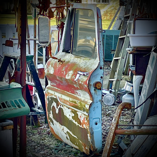 It is it's own niche. Not antiques of high value. Not a Salvation Army style or thrift store type of place (prices here too high for that). But....mostly old stuff of the kind you'd find on the street or a garage sale of a really old person or a junk yard back yard up north someplace or the garage collection of stuff from a person who would spend years collecting knowing it would be useful to 'someone someday'. Like the car door. That's the niche. Someone someday is going to grab that and be so thrilled and say "I remember when....." Then maybe they'll make a cool sign at The Barn to go with it with all the stencils they have for saying what's in your heart and mind. I liked the vibe of the place but didn't buy anything. They had lots of ceramic plant holders...which I often cruise for.... but $35 or so is not my personal niche price. But I did love the funky car door and thought it would make a cool piece of yard art with plants hanging all over it (in the Detroit Heidelberg style of decorating) and the entrance is extremely picturesque and a good hint to what's inside. You just might...