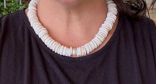 I bought a South Sea Pearl Puka from Kim last week while vacationing with my husband in Oahu. It is arguably the most stunning piece of jewelry I own. Despite the weight you feel when you hold it, it was weightless on my neck. My neck and décolletage area has become increasingly sensitive with age, but my beautiful puka was so comfortable, I forgot I was even wearing it. It looks like it was designed for royalty, but can be worn with both casual and formal clothing. I’m so happy I splurged (a splurge for me anyway) and brought back this gorgeous piece. I also bought a White Pearl Sunrise necklace for my college-age daughter, which I’ll give her next week when she’s home for break. Kim knew it was a gift and packaged it beautifully for me. I know she’ll love it. And last, but definitely not least, Kim gifted me a “mountain to sea” jade bangle. The colors are so spectacular, and it’s sure to be a conversation piece every time I wear it (which will be very often). These pieces are designed to be family heirlooms, and they absolutely have that...