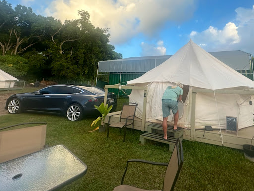 The area is peaceful, quiet, and dark at night. We could sit out at night and see the stars and some planets clearly. Really feeling the solar string lights in the tent, it gave the tent nice subtle lighting. The hammocks outside are a nice touch and I took advantage of it soaking up the Laie sun. There are picnic tables which we used to cook breakfast every morning before we took off on the day's adventures. We met other campers (mainly college students from Canada during our stay). We made new friends and my wife cooked dinner for everyone during our last two nights. It was a great experience!