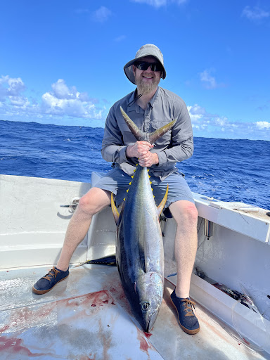 In October 2019 my son and I went on a fishing trip with Captain Chris and had a blast. In my son's words: In the fall of 2019 I went on a charter fishing boat and the captain and his crew were very nice and patient with me, gave me lots of tips on how to catch fish and how to use the fishing pole and line. They cheered me on and my Dad when we had a fish on and told us how to reel it in. During the trip we first went a few miles out to chatch the bait fish which were things like small tuna and mackrel which the captain and his crew caught themselves. Then we drove out a few more miles to find the buoys. The first thing I caught was a baby yellow fin tuna which we threw back in the water so it could grow up to get bigger, the next thing I caught was a skipjack tuna which was really fun to catch. Later my dad got a huge 5 foot Mahi mahi that gave him an equally huge fight. My dad came out victorious and extremely proud. I was able to catch 3 mahi mahis and almost catch a 20 pound tuna. I totally loved the trip and hope to go again.
