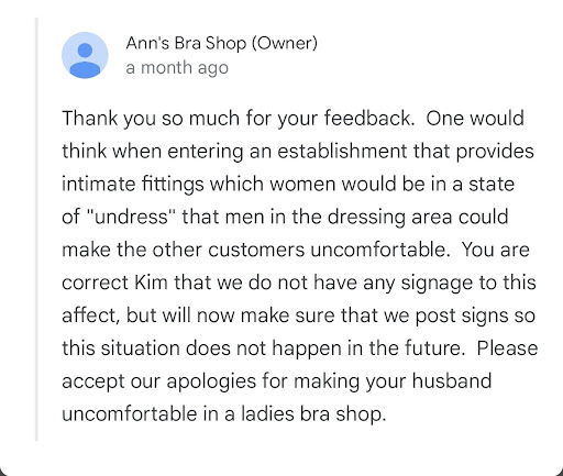 Thank you for your quick response. I believe signs would help. We have never been to your store before, we were on a mission to find a bra and were focused on our task. We may have stayed if the employee would have taken the time to address us quietly in person instead of shouting at us from across the store and making a scene. It did not cross our minds for the reason when I have shopped at other female specific stores for bras he has accompanied me without any issues. He and I would never want to make anyone feel uncomfortable. As soon as your employee shouted at him he quickly complied and went up by the doors and I followed. Maybe there is a solution to be considered to provide better privacy for your customers that are in "a state of undress" as you said. So no one that enters can see anything that would make your patrons uncomfortable. We left your store immediately, so no issues could continue without making a scene or making any statements to your staff. With reading your response, I gather men don't attempt to buy anything from your store for their significant others. Your apology seems backhanded. Have a...
