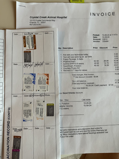 ****Be careful Scam company*** !!!!! I have a poodle puppy we came to crystal creek animal hospital we did the whole series of vaccinations the dog needed to have, because she is small under 4 pounds she could not have 2 vaccinations on the same day I was asked to come back a week later I came to my appointment there was no time to receive me at 2:00 PM I waited after waiting 30 minutes I went and came back again at 5:00 PM and again I was not accepted after waiting 20 minutes I had to reschedule for 6:00 PM and finally they told me to arrive the day after at 17:00 I arrived to do the last vaccination for puppies at the counter at the entrance I was told that this is the last vaccination, When I entered the treatment room, the technician claimed that this was not the last vaccination and that if she does a rabies vaccine that costs $24, you have to pay another consultation of $60 to the doctor, but I had already been a week before and paid that money (they could not vaccinate her with both vaccines because they claimed she was too small) After that they said that if she does the rabies vaccine she should do another series of vaccinations The dog has already had 5 vaccinations and is 4 months old Scam company!!! Now they lie that helped me They don't help me with anything, they let me go and come back 3 times and postponed my appointment, and in addition to all this I paid the week before for tests and everything. It's just that the dog is small, so you can't give her 2 vaccinations a day When I was told that this was the rabbit's last vaccine, they continued to say that there are more vaccines to take more money, liars