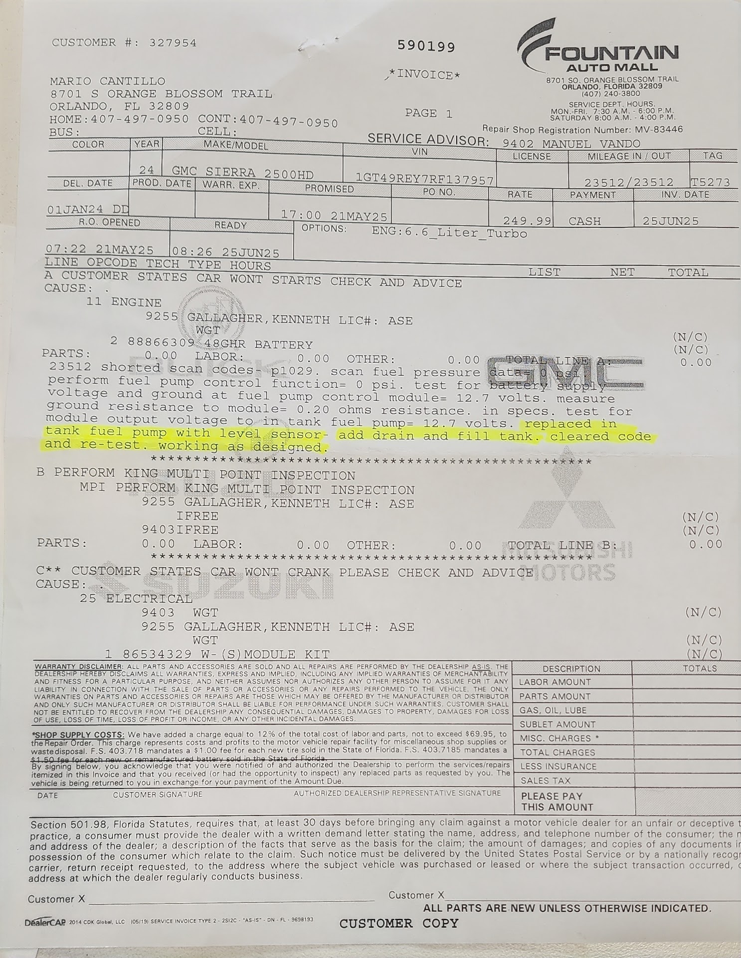 Read moreThe worst experience. On May 8th, I had to tow my 2024 GMC 2500 pickup truck with 20,000 miles and under manufacturer's warranty to the dealer because it wouldn't start. I called to ask about my truck. An Answer Machine answers, giving you many options, but none of them answered. Finally, after three days, they delivered it to me. I went home. In the morning, all the lights started turning on and off. Another couple of days in the shop, the same communication problem. On May 20th, I had the same problem: the truck wouldn't start. All the lights stayed on and blinked. I had to tow it back to the dealer. And again the odyssey begins, Call the dealer... They don't answer, and if someone does, they say they don't know anything but to leave my name, phone number, email and that they will call me back, (something that never happens). After 8 days of waiting and without a response, I call the Manager Nestor Diaz who obviously doesn't answer, I leave two messages on his answer machine, with my name, phone number and asking in a friendly way that they please give me an answer about the damage to my truck since it is very important to me, because it is necessary for my work. He never answers my messages, so I decided to go to the dealer. At that moment my truck was parked outside the shop in the same place it had been for 8 days; I ask about the status of my truck and no one can give an answer, I was able to speak to the Manager, who is supposedly the customer service person, and he responds in a rude and impolite manner that what I need to know, I respond that what is wrong with my truck, what is the problem and how long will it take, to which he responds that the technician is not there and that they are waiting for a spare part, that this is GMC and it can take from a month to 6 months for the part to arrive. I ask him about a rental car because it is too long, to which he responds that rental cars are a courtesy of the dealer and not for GM. That I leave my phone number and that when the truck is ready they will call me. I call GM, I tell them the problem, they tell me that there are no spare parts that can take that long, that they are obligated to give me a rental car because GM pays them and if they don't have one, give me a voucher for a rental car. The GM representative opened a case and told me the dealer had 48 hours to respond. After 5 days of waiting, I called GM again, and the representative told me they hadn't answered and that I should please give them another 48 hours... but there was never a response. After 35 days of waiting, the truck was still in the same place. I had to hire a lawyer, and as if by magic, the next day the truck was washed and fixed. It took them from May 8th to June 25th to replace a fuel pump sensor? I don't believe it. Thank you, GMC Fointan Auto Mall, for waiting, and I hope none of your customers have to go through...