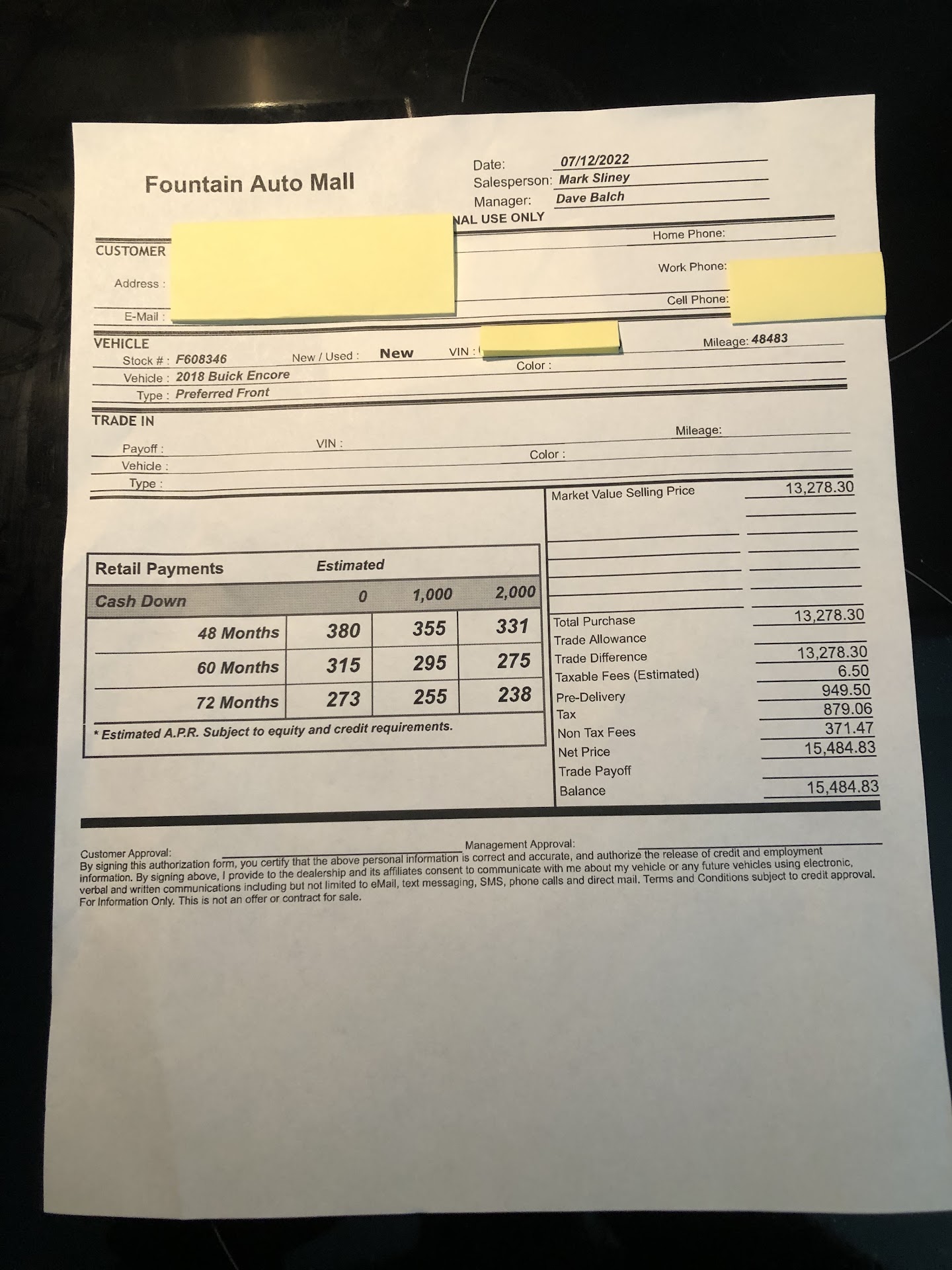 We were paying with a personal check and I was told I had to fill out a form for the IRS because of the high amount of the check (this was over an hour into the whole deal and I do not fully understand why everything was taking so long as we only pushed back one time on the price). Let me tell you paying by check or credit card is a nightmare! I also had to give them references....strange