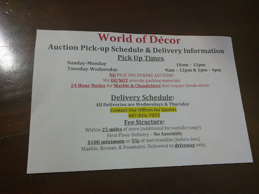 Read moreFRAUD! Do not order products on line from World of Decor. Why? I placed an order 2 weeks ago for an in stock item. Their website says "FREE SHIPPING." I received a receipt of payment and of course the receipt also shows no charge for shipping. It's been TWO weeks and the item still has NOT shipped. I received ZERO notifications about shipment from them. Nothing. When I checked my order on line at their website, it states, "Awaiting Shipment." My emails that I sent to them to check on my order went ignored. I called and did get someone who told me that FEDEX had changed how they charge for shipping larger items. (And that's my problem?) So, as I sit here this evening, this store has my money and my item isn't shipped and I don't know when or if it will be. Do I want the item? Yes. Do I trust these people? No. Not when they made no effort to advise me of their shipping issues, or better, ship the item AS PROMISED! I don't know how a business can advertise "Free Shipping," and then not ship the item. I am NOT going to pay for shipping. I think it's a scam!