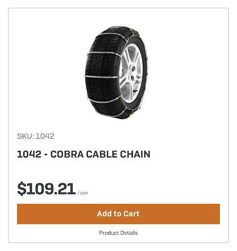 DO NOT BUY SNOW CHAINS HERE!!!!!!!!!!!!!!!!!!!!!!! The snow chains are required to enter Yosemite Park at SNOW times of the year. We were driving a new 4WD Nissan Pathfinder and STILL HAD TO CARRY CHAINS. So abiding by the rules, we turned around from Yosemite Park Gate on rt 41 and stopped at GENERAL STORE in FISH CAMP, CA a couple miles from Yosemite Park entrance because they advertised SNOW CHAINS via banner in front of store We spent $160.00. We never opened them AT ALL to use them, as the sun had melted all the ice on the roads at NOON time of day in mid-April. Sunny days are hot in high elevations this time of year. Upon leaving the park, I pulled out the receipt for the SNOW CHAINS and STAMPED IN RED: NO RETURNS ON SNOW CHAINS was on my Receipt. Stopping to return them, in no way, shape, or form would they take them back untouched WHY NOT CHARGE A $30.00 RESTOCKING FEE FOR UNOPENED PRODUCT INSTEAD OF SCREWING THE CUSTOMER?!...
