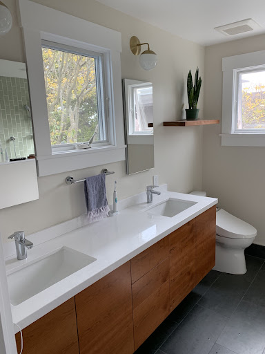 Our job was a full kitchen and bath gut on our '20s Oakland bungalow, down to the studs (and then some). We had a lot of moving parts, knocking out wall sections, all-new cabinets and appliances, floors, window, you name it. Elyse nailed every single detail down to the inch. She helped us custom-design a shallow cabinet/countertop for our funky door. She created our huge set of pantry cabinets around our fridge out of a few spitball ideas. She helped us make a custom hanging cabinet for cat food/treats with an under-cabinet hideaway water fountain. We have a wine fridge cabinet and a cat litter box cabinet. The details in our kitchen are amazing, and we have her to thank.