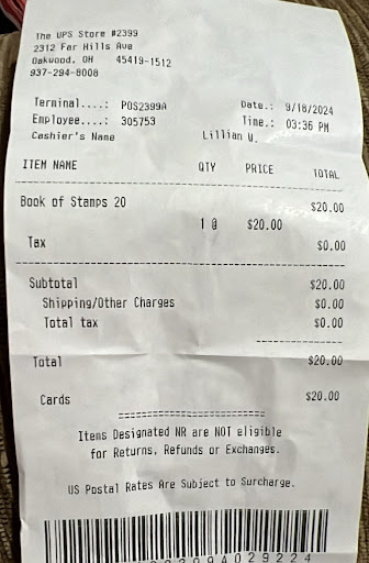 My husband went to the UPS store in Oakwood to do business and while there bought a book of stamps. As he was walking to the car which was parked on the side street due to store front pavement construction (no vehicle drive / parking and not a big deal, only elaborating for time frame purpose), once at the car he realized they charged him $20 for the book instead of $14.60 at federal cost. Now, I suppose not asking if they up charge ($5.40 per book) is my husband’s fault. He immediately called the shop from the car which was parked around the corner, he spoke to Zach. He was told they do charge $1.00 per stamp and they cannot issue a refund, that sales are final. My husband asked for a supervisor to talk to, was told he was the supervisor. My husband asked to speak to whoever was over him or a corporate number and was told he is unable to give a number because they are franchise. My husband left his name and number for a call back and was told that he may not get a call back that it was up to the manger if they wanted to call back. That itself alone is extremely poor business. However, my husband did get a call back from Carrie who said no returns / refunds as she states the receipt says not refundable (not true). The funny thing is the receipt does NOT say the stamps are not refundable (receipt attached for transparency, item is NOT marked “NR” as the receipt states items will be marked if not refundable). So this morning my husband went in to talk to Carrie who was not there and later spoke to on the phone again. He was told it was a training error that he wasn’t told that sales were final on postage stamps, that they will be talking to all their employees to avoid this in the future and that there was a sign up in the store to alert customers (also not true). My husband asked Zach to show him the sign, which he looked all around and couldn’t produce the signage. Zach also commented that knowing the costs of what other people sell postage isn’t his job, that they are not purchasing from the post office so they are a business and who needs to make money off them (again, although the pricing is not displayed anywhere in the store). Our error was my husband not questioning before he swiped his credit card and we 100% own that mistake. In typical scenarios my husband would have noticed immediately, however he has recently had severe brain trauma following brain surgery a couple months ago and is still cognitively recovering. This was a lesson learned to slow down and make sure businesses are not taking extra advantage of their loyal customers.