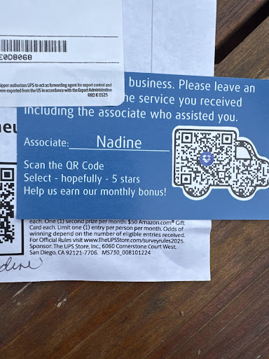 Read moreTotally disgusted by the way, I was treated at the store today. I walked in to the only customer service person at the register. I was first in line and I stood there with my box and she said one moment I have to straighten up as she dusted off her register and sorted her little cards all over the place, her name was Nadine. I asked her if they made copies. She said oh yes we do. I said how much I don’t know I am clueless and started giggling like a schoolyard girl. She continued cleaning her area and I said are you going to take my box Oh, in just a second and I said well times up I’m in a little bit of a hurry and she giggled, but continue to clean. Another person came in another cashier came to another register service them. Another person came in and the third service person Took care of them. Both of them had completed your transactions and went back to work in the back, Nadine was still straightening up her counter area. I asked her if she could please hurry up and she giggled and thought it was funny and I told her I am not amused. It’s not funny. I’m in a hurry. Well, she just laughed more. UPS is supposed to be a service business which provides courteous and prompt service. I did not receive either one I felt like she was laughing at me every time I asked her a question or let her know that I was in a hurry and as far as her helping me in a prompt matter, she took her good old time totally...