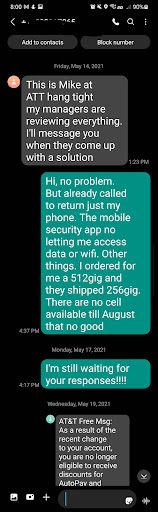 Ā Ā Ā Read moreWhen I say that Iāve never had such a bad experience with a company in my entire life, I mean that quite literally. Raymond is the last person who should be working in a customer facing role. He lied to me from the second I walked in the door. I came in with a broken phone and asked how I could get out of my contract. I explained that I had had such bad experiences with ATT in the past (this store has a history of lying) that all I wanted to do was to change carriers. He assured me that my best option was to trade in my phone for a $800 credit, the same price as a new iPhone. We were getting ready to leave for vacation, but he told me we had 30 days to return the old phone. After agreeing to trade in my phone for the $800 credit, I requested a purple iPhone 14. He went into the back to find one, opened the box, turned on the phone, and then realized he had actually grabbed a black phone. He told me that with a case, a black phone could look purple. When I insisted that I wanted a purple phone, he told me that they were out of stock and I was stuck with the black phone since it was already opened. When I checked online later, there were actually purple phones in stockājust another lie. Raymond said that my phone was taking longer than expected to transfer information, so I should take it home to finish the update and bring it back the next day. I told him that I was going on vacation, so I wouldnāt be able to come in the next day. He assured us that we had 30 days to return the old phone as my trade in. When we returned to the store after vacation ā 16 days after purchase ā we were informed that the old phone was only worth a $350 trade in credit, and not the previously promised $800 credit. Raymond then accused my husband of lying, saying that we had swapped the phone or that he had never seen the condition of the old phone. That is a lie because I came in with a broken phone, explaining that I was there because my phone was broken. Raymond held my phone and scrolled through it before going into my iCloud to sync the new phone with the old phone. He was very familiar with the condition with my phone. From the second that I left the store to go on vacation to when I returned, the condition of the phone did not change. We then requested to return the new iPhone 14, since it was clear we were not getting the promised credits. They told us that we were out of the return window. After spending 2 hours on the phone with customer service and hearing more incorrect information, I wasted a second day driving to two separate ATT stores who gave me different information and told me that both Raymond and the corporate customer service had given me wrong information. So now I am left with a broken phone, an ugly black iPhone 14 that I never wouldāve purchased, and either an $800+ bill or a 3 year contract with the worst company in the world. This experience coupled with the absolute trash customer service from corporate ATT has caused me and my entire family to switch to Verizon. At least they accept any condition of...