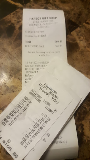 Read moreA cute little gift shop in harbor Oceanside display size shirts hats and knick-knacks anything you can think of without inside along with some sweatshirts and hoodies they are pretty cool as well. They have two shirts for 22 and 3 shirts for 33 I got two shirts for my brother and they're pretty neat. if you're looking for a cool gift to give someone that has Oceanside or San Diego stuff on it, this is a perfect...
