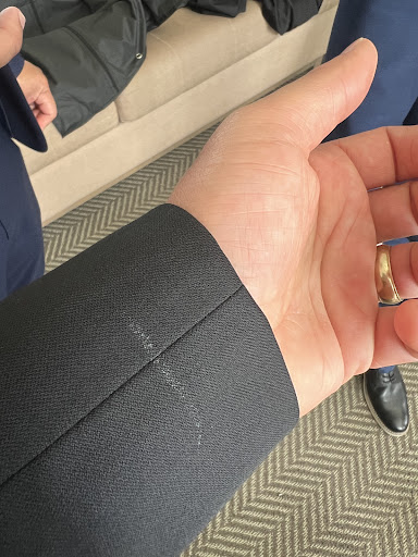 Had a bad experience months ago that I still think about. I decided to put trust in the staff rather than make my own choices and it was a mistake. I asked for a blue suit and had the pants and jacket pulled off the rack for me. The pants were too tight and I asked if I could go a size up. "Actually we can let them out for you to give you room!". I'm not sure why I couldn't just get a different pair of the rack, but alright. The jacket was a little off looking but I figured maybe it was because I didn't have the right shirt to match. They measured the suit and one sleeve was a fraction of a centimeter longer, so that too was altered. I figured it couldn't hurt.