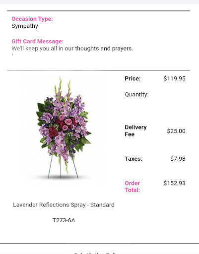 I ordered this beautiful spray to be delivered to my grandmother's funeral. I called the morning of the service because I couldn't locate any spray. I discovered this vase with similar color flowers with my card and sentiments. When I told the lady at Ocanto floral that this was clearly not what I ordered, she said she would make another one and make it right. As you can see, the second one is a spray but lacking half the flowers. The entire ordeal was disappointing and embarrassing. I was charged the full amount for a disgraceful...