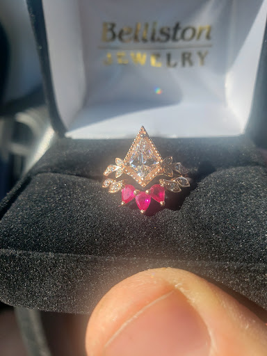 Read moreBelliston has been excellent to work with from start to finish. My fiancée and I were greeted soon after entering the store by Ellie. She took us around the cases and happily showed us any of the rings that caught our eyes and helped us narrow down choices. We found a ring that we really liked but still wanted to make some customizations, including a kite cut diamond, which Ellie noted and started to search for. It took quite a search but they were able to find a diamond maker who could create a custom diamond to make our dream a reality. Soon afterwards, one of the designers, Michelle, reached out and showed me 3D models of the ring and we were able to work through a few iterations to arrive at a design that perfectly captured our vision. Michelle was very responsive and capable and a pleasure to work with. A couple weeks later our custom ring was ready and well within the timeframe they gave me for completion. The final ring and wedding band are incredible and we could not be happier!!! The store staff was so encouraging and excited for us. Most importantly, my fiancée is absolutely thrilled with the final result and will treasure these rings for the rest of our lives together! Those at Belliston realize that they are helping people create one of the most important memories of their lives and make the process enjoyable and the final quality of the ring...