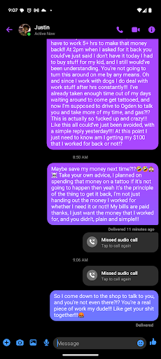 I'm sharing my story in hopes that this won't happen to anyone else. So back in December, I had reached out to Justin Vepar (Justin Huffman) (working at Blood and Ink tattoo) about getting a tattoo. Everything seemed to be normal and good at first, but by the end of it I'm wishing I had never even associated with him. We had an appt scheduled for the 23rd of January, and he first changed the time, then said he couldn't do it that day, I was understanding. Then he rescheduled me for the 28th. Again he changed the time and I was understanding. Then a half hour before my appt he said he had no way of getting into the shop. Again I was understanding and told him I would wait until someone could let him in. I waited around until 2pm, and then asked if he could send me me deposit back, and maybe we could work together in the future. He said he would, and then didn't message me back. Until I messaged him the next morning, and that's when things took a turn for the worst. I'm now being told he has no obligation to refund my deposit, even though I tried every step of the way to be understanding, and make the appointment happen. He told me to come in and talk to him, but he wasn't even at the shop. I consider myself to be pretty kind, understanding, and easy to work with, and I think anyone who knows me would say the same. Well here's the run around I've been given, and I just don't think it's very professional, or reasonable at all. So if you're thinking of getting tattooed by him just know there's a big possibility this could happen to you too.🙈🤬🤬🤬 Conversation goes from the bottom up, I don't know why I wouldn't...