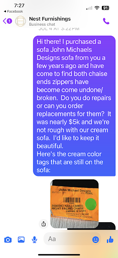 Ā Ā Ā Read moreGreat sofa from John Michael Designs. Nest Furnishings is really nice to you until you've purchased a piece of furniture. They have your money, no longer need to kiss your behind, right? I have been inquiring for help on how to order replacement covers for my sofa chaise ends for over a week (the zippers broke) No one answers the phone or texts. I then decided to message on Facebook where it shows they've read every single message I've sent. Not one response. I had to contact the manufacturer directly who thank goodness referred me to a different store nearby that will help me. I do not recommend this store due to poor customer service. AWFUL, AWFUL, AWFUL. And yes, I have screenshots. UPDATE: The owner of nest furnishings finally did respond after I left this review. Had some questionable interactions when it came to customer service. Zipper was fixed. I paid for it because I was never looking for a handout. All I needed was help and to be pointed in the right direction. The owner never actually uttered the words: I'm sorry. She refuses to be held accountable for looking at my messages and leaving me on read for over a week, no one answering their phones or texts (business line during business hours). She did however send me quite a laughable email because I had forgotten to take this review down. She threatened to respond publicly to my review (gasp!). I asked for an apology for what they did wrong customer service wise and I would take the review down. Instead she responded to the review. Yes, I have screenshots of those emails as well. Dont worry, Corinne, I just added those. She also mentioned in her response that I contacted them after hours. Just look at the time stamp on those messages I sent. I highly doubt business hours end before 3:22pm on a Friday. If you're going to flat out LIE, at least be smart about it. So moral of this avoidable long story: the sofa's great, just buy them elsewhere. All I needed was a little help pointing me in the right direction and an...