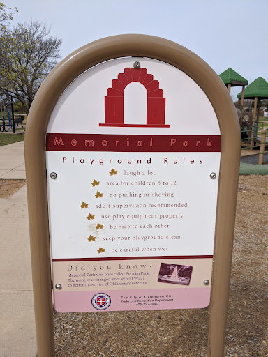 Read moreMemorial Park has something for everyone! This park is huge, spanning from classen to Western. It is surrounded by a great quality sidewalk and lots of lighting. There is only one porta potty near the parking lot though, which is about the only drawback. There are plenty of benches and picnic tables with four tables covered. The park has playground equipment for children ages 5 to 12 with supervision recommended. The ground is wood-chip with that rubbery impact material under the slides and swings. There are four baby swings and four big kid swings. There is also a hopscotch and maze and running path painted on the ground, which is more elaborate than any other I have ever seen. They have an additional climbing structure for children that looks like natural rocks with ropes string between. It has its own warning about safety and supervision. The park has a decent soccer field, which is surrounded by a berm so the ball won't roll away forever if it goes out of bounds. There is also a running track around the soccer field which is in decent shape, but starting to show some wear. There is one full size basketball court and the hoops still have nets. There are four tennis courts with high quality nets that are in good shape. They have a splash pad also. Lastly there is a very large fountain with lots of seating around it. There is handicap access all the way to the bottom, since it sits in a natural bowl formation. There are big...
