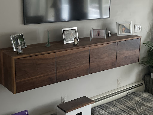 We have know the owner of Her Woodcraft for many years and saw a raw talent develop as she began her wood working career. We visited her workshop and we’re very impressed with all the equipment she had and saw many other pieces that she was working on that were such beautiful craftsmanship in our opinion. We asked if she would be interested in building us a custom cabinet for under our TV to house all the electronic components. She suggested a floating shelf/cabinet with 2 drawers and 2 opening doors. We chose walnut for our build so it would match the rest of our decor in our home. The piece was completed in a matter of weeks and delivered to our home for installation. My wife and I are so pleased with our new piece of furniture we had them build us some floating shelving. They came out beyond our expectations.