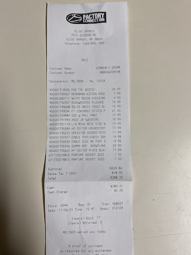 I spent 288.76 on 11/6/21 in that purchase I had one pair of boots. In the store I tried the left one on to make sure it fit. On 11/9/21 I took boots out the box and was going to wear them, Well the right one was damaged on the inside and had a lump where your heel would go. I took the box with all the paper that came in the box to the store 11/10/21 all I wanted was a pair that were not damaged. Daisy assistant store manager had the worse attitude ever. She acknowledged that they had not been worn and were damaged but immediately starts with I need the receipt, I had left that home in my desk. I asked can you pull it up by my telephone number? She says NO - I need the receipt, seems as if the only words she knew were I need the receipt. I had a picture of receipt in my phone from an app Fetch that I scan receipts on. Guess what she said??? I need the paper receipt, All I wanted was a pair of boots that were not damaged. She said they were out of stock in my size. Daisy did not try to assist me in form or fashion, She gets a 0 in customer service. Ladies keep your receipts and be careful, Factory Connection will gladly take your money but could care less if you have a problem with an item that you purchased. I am headed back there now with my paper receipt...